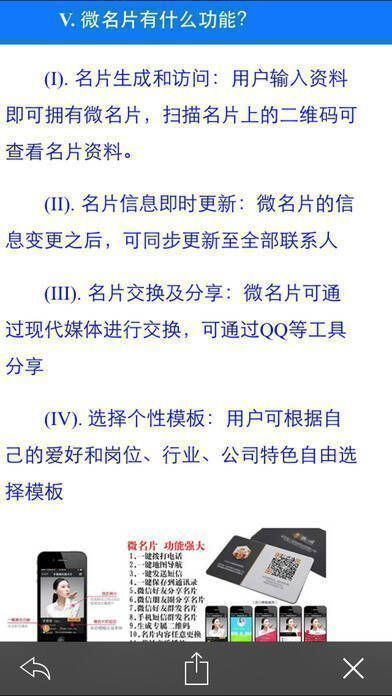 2、携带方便,可以使用手机转发,可以随时更新,由于是电子文档的格式,可以随时修改增删宣传内容,成本低,制作微名片,多媒体名片,微商微信所属名片功能,可以随用随做,无需最小订货量,减少资源浪费,客户索取样本,无需通过快递邮寄,转发其微名片就可以,展示企业创新意识,突出企业形象,设计精美,有交互菜单,在复杂的内容也会变得层次分明,浏览简单;