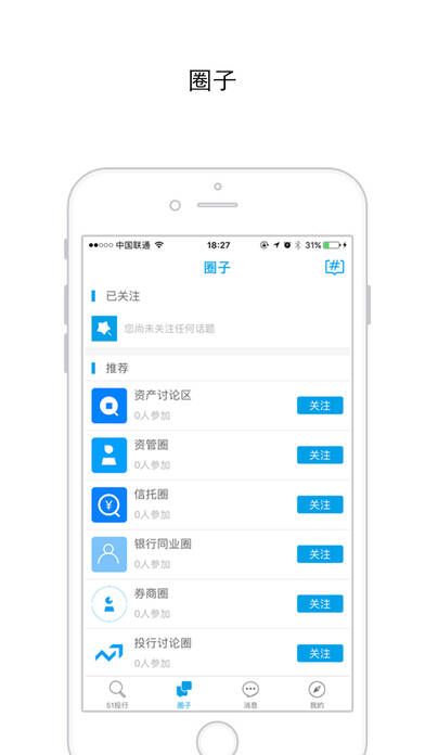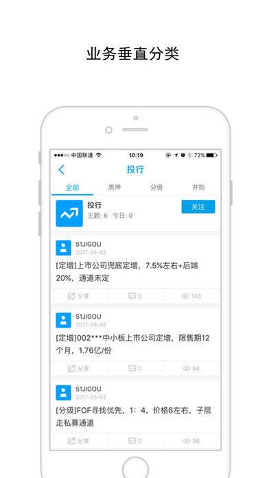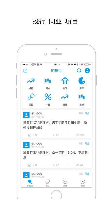 51投行——投行同业者的聚集地。它为金融机构业务经理人打造社交圈,按业务垂直分类,更精准地实现业务匹配与撮合。涵盖业务范围有:投行、同业、政信、项目、资产、产品等。作为一款投资类手机软件,这里有最新资讯,助您洞悉理财行情,还有众多优质稳健项目推荐,快来体验!