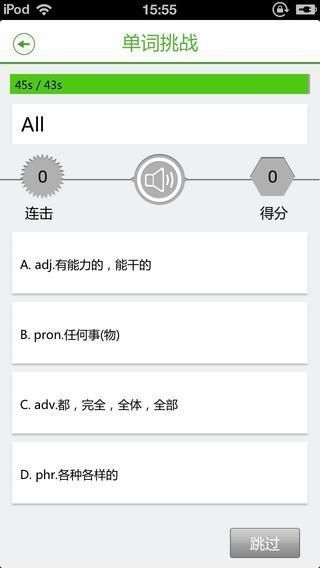 《单词刷刷刷》让大家能在各类闲暇时间便捷学习英语单词,积累足量词汇为英语学习筑牢根基。应用收集了中考、高考、大学四级、大学六级、托福、雅思、SAT、GRE 这八个方面的关键单词,还有常用短语,能满足从中学到大学,直至出国读研的英语词汇需求。