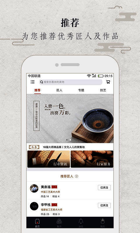华夏匠人 APP 是一个手工艺文化生态平台。用户能在平台浏览、购买、定制心仪的匠人作品,领略古典文化艺术魅力,交流匠人文化,还可与匠人直接沟通,深入了解民间手工艺品文化体系。