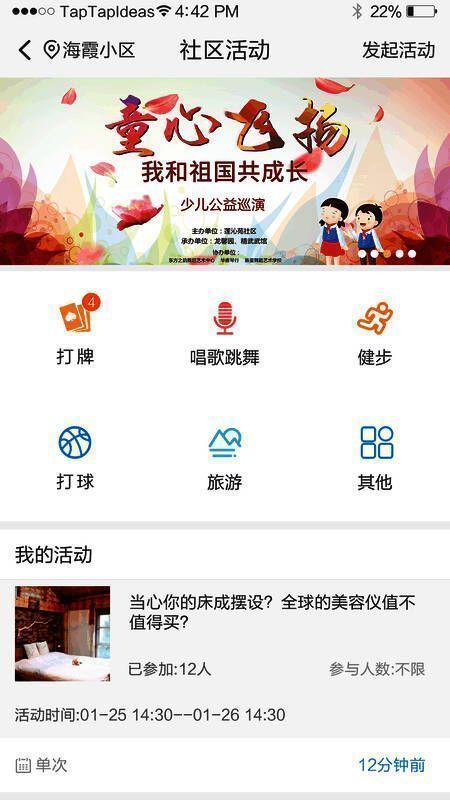 1、自选社区活动,打牌、打球和旅游、健步和唱歌跳舞与其他的社区活动可以自选;