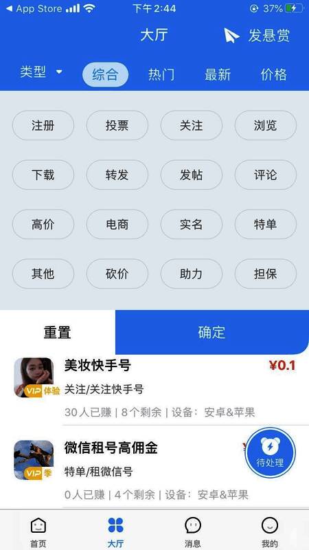 2. 软件每天提供大量简单的手机任务,如砍价、帮忙、点赞等,单价1 - 5元/件。