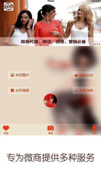 它是微商从事代理、经营微店、寻找货源以及赚钱时必备的水印修图、视频拍摄工具。《微商相机》专为微商设计,是一个集水印视频、秒拍快速加水印、去水印、裁剪、涂鸦、找原图、批量水印制作等功能于一体的平台,能帮助微商提升生意,增加收益。