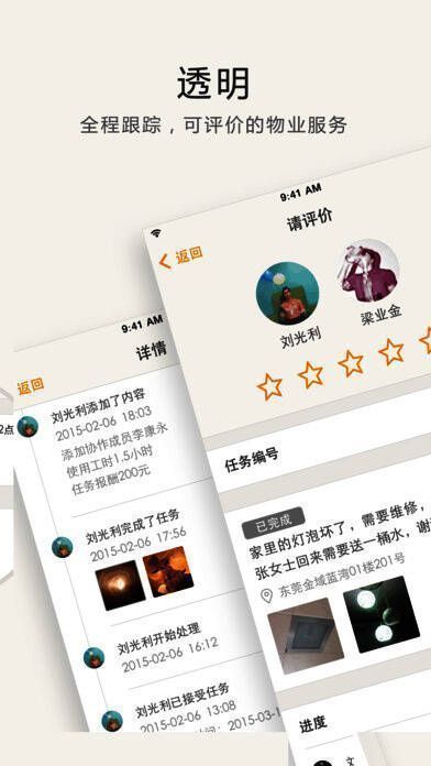 - 更多一点阳光:可对服务打分、监督设备维保,推动阳光物业发展;遵循一套服务标准,共同提升物业服务细节。