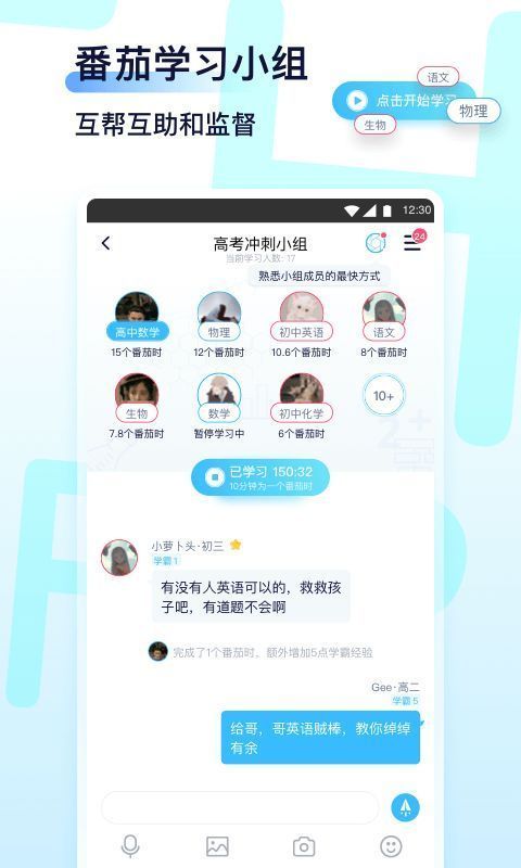 4、番茄学习模式,在学习小组中共同快乐学习,互帮互助、解决问题、相互监督,提升学习效率。