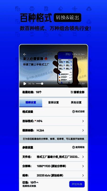 1. 视频格式转换:支持全格式视频的任意转换,可自由设置和修改视频分辨率、比特率、帧率等,支持mp4、m4v、mkv、mpg、ts、mpeg、mov、wmv、asf、avi、vob、flv等格式。