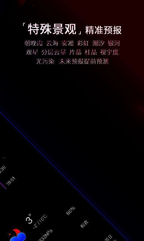 3. 云海预报:能显示附近 100 公里的云海最大概率、高度和光照条件等信息。