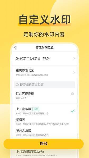 修改水印相机是一款功能强大的多功能应用,融合了拍照、添加水印、视频录制与编辑等功能。它拥有海量水印模板,用户可按需随心挑选,拍摄时能实时添加水印,照片和视频都能轻松处理,让影像独具特色。而且,该相机时间定位精准,提供打卡专属水印,对标北京时间,位置精确,适用于项目巡检、考勤打卡等多种场景。