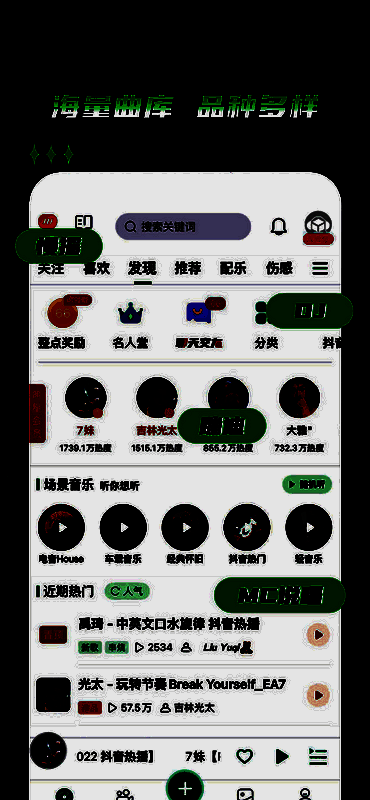 这里精心准备了车载电音、网红喊麦、高品质广场舞歌曲、超重低音、大型串烧、3D环绕音乐,还有DJ版手机铃声等,等你来体验。