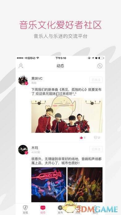 3、音乐人可通过手机发布文字、图片动态,如演出照片、幕后花絮、生活状态等,让乐迷更深入了解自己。