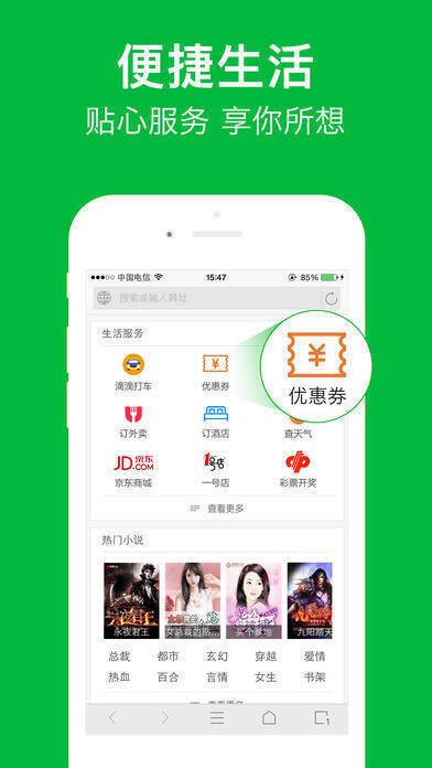 这款最流行的手机浏览器,超500万人使用。速度极快,瞬间抵达网页,帮用户节省60%流量,还能免费追小说、追剧。