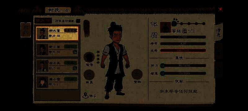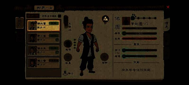 这游戏是有生死系统,打开村民主页,可以查看他能活多少岁,年龄越大,他样貌就会越老,就越接近死亡,不过不管他年龄多大,你都可以让他来进行工作,没有养老,只有压榨