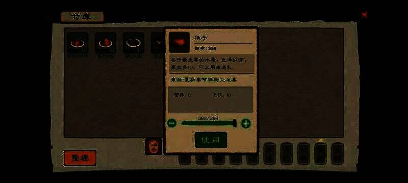 这时我们就拥有了400个桃子,这桃子可以直接吃的,我们打开仓库,点击使用食物食用桃子,直接拉满,把桃子全吃了,当然,你也可以省着吃,把桃子放上家宴啥的