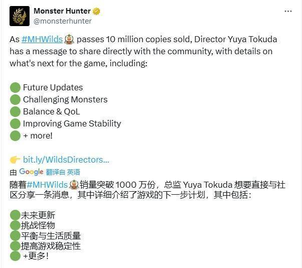 卡普空为《怪物猎人:荒野》公布了2025年上半年的免费更新路线图,与此同时游戏总监德田优也(Yuya Tokuda)与玩家社区共同庆祝游戏销量突破1000万份。