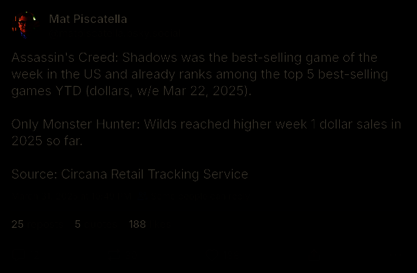 2025 年第一季度正式结束,销售数据也已统计完成。根据游戏市场数据分析机构 Circana 的分析师 Mat Piscatella 称,育碧于 3 月推出的《刺客信条:影》是 2025 年至今最畅销的前五名游戏之一。