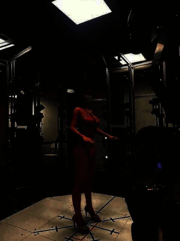 从图中可以看到,尹雪花身穿比基尼和渔网袜等性感服装,大量摄像设备对准她的身体扫描,进行模型采集工作。