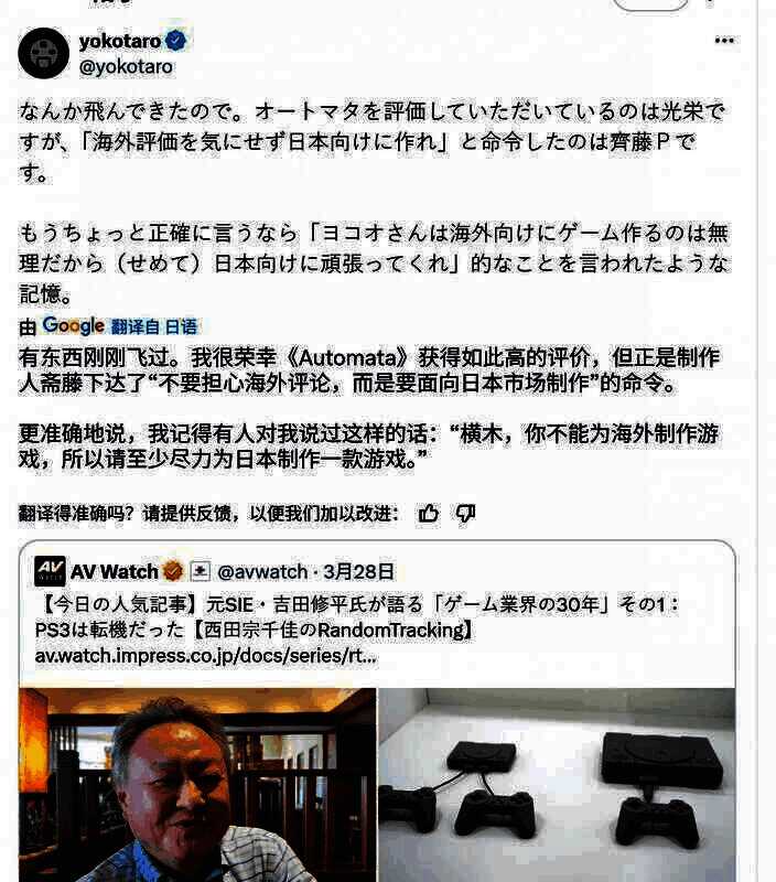 横尾表示:“突然收到这么个消息。我很荣幸《尼尔:机械纪元》获得如此高的评价。不过,【别管海外评价,专心做给日本市场】的命令可是齐藤下的。
