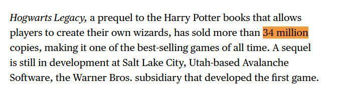 根据彭博社消息,作为《哈利波特》小说前传的游戏《霍格沃茨之遗》,其累计销量已经超过了3400万套,是有史以来最畅销的电子游戏之一。