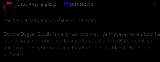Double Dagger Studio工作室宣布,旗下销量已经突破百万的好评治愈系冒险游戏《小猫咪大城市》5月10日登陆PS平台,本作已经登陆Switch、PC、Xbox One和Xbox Series X|S平台。