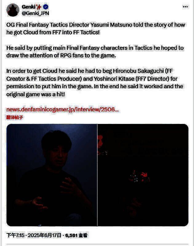 在接受日媒采访时,《最终幻想战略版》原导演松野泰己透露了如何将《最终幻想7》中的克劳德加入《最终幻想战略版》的故事!他说,通过在《战略版》中加入《最终幻想》主要角色,他希望能吸引RPG粉丝的关注。