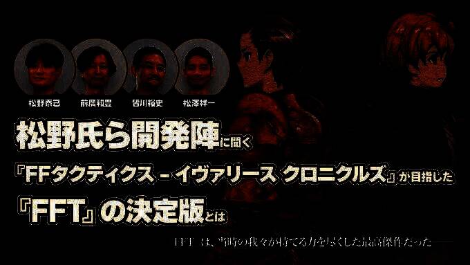 SE确认《最终幻想战略版》初代游戏的多个主创回归,制作新的强化版本《最终幻想战略版:伊瓦利斯编年史》,这包括初代游戏设计师前廣和豊(Kazutoyo Maehiro,目前担任强化版的游戏总监),初代游戏美术总监皆川裕史(Hiroshi Minagawa,目前担任强化版的美术总监),以及初代游戏导演松野泰己(Yasumi Matsuno,目前担任强化版的场景编剧和编辑)。