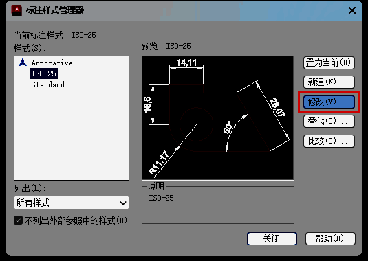 第三步:弹出【标注样式管理器】,点击【修改】,如图所示。