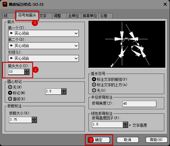 第四步:点击【符号和箭头】选项。设置箭头大小:【10】,点击【确定】,如图所示。