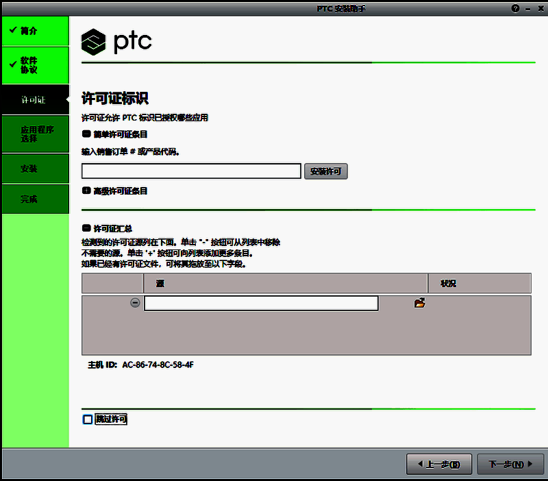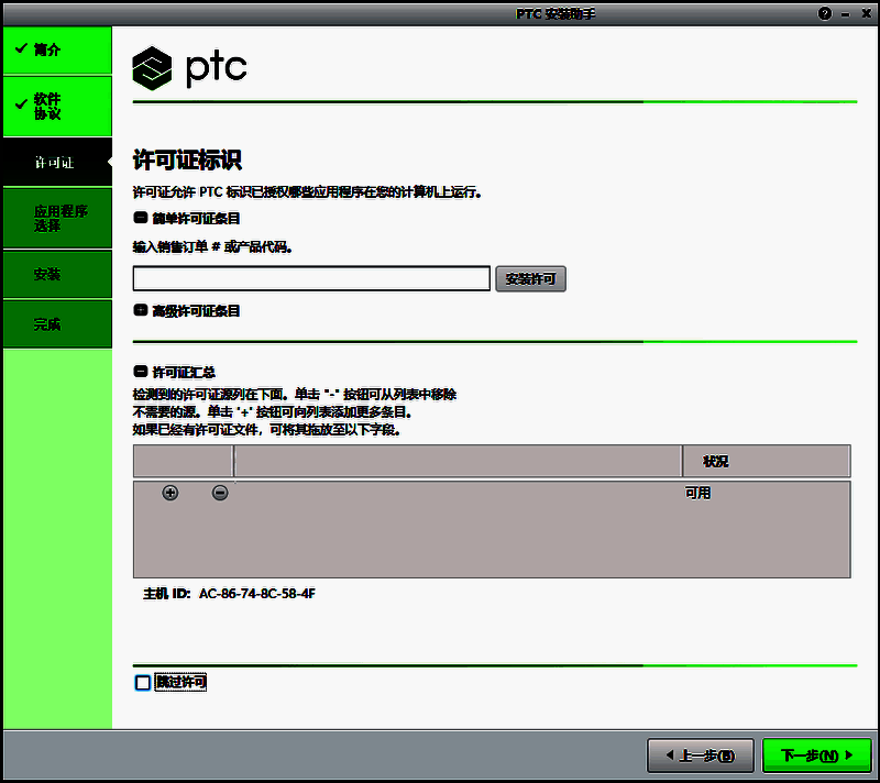 9、如果你还没有改到许可文件,就勾选跳过许可。点击下一步,如下图所示: