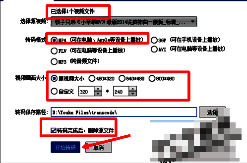 3.然后就会打开转码页面,我们在里面可以选择想要转码的格式,下面设置视频的尺寸,保存路径等,确认没有问题的话,点击开始转码即可。
