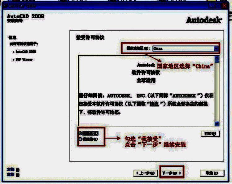 第六步:进入到【AutoCAD2008许可协议界面】,在国家地区选择【China】勾选【我接受】点击【下一步继续操作】