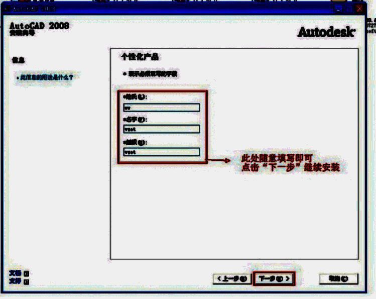 第七步:到了这一步,AutoCAD2008的用户信息可随意填写,然后点击下一步。