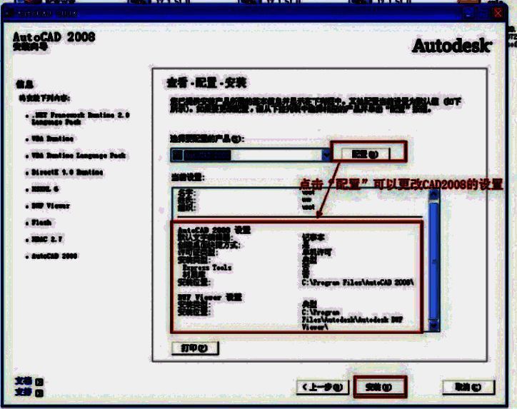 第八步:AutoCAD2008 32位中文版的配置,安装信息红色框内是CAD2008的安装信息,点击配置可以自己设, 点击【安装】开始安装。
