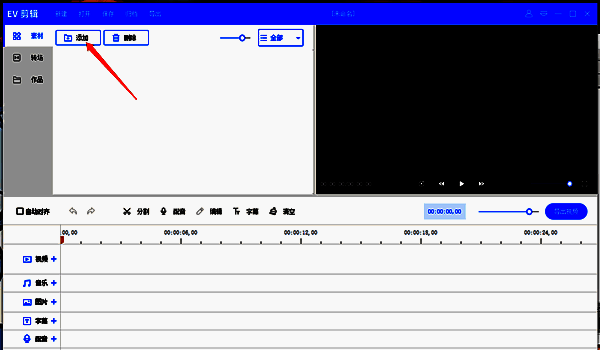 1、启动EV剪辑软件,在左侧上方有一个“添加”的按钮,点击添加我们所需的封面图片。