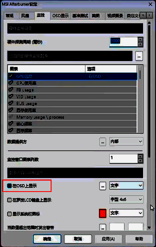 3.在监控页面,您会看到一系列可供选择的数据项。您可以根据自己的需求挑选想要显示的数据,比如GPU使用率、显存使用率、核心频率、CPU温度、帧率等。选中这些数据项,并确保在下方勾选了“在OSD上显示”选项,这样一来,在游戏过程中,这些监控数据就会在屏幕上实时显示了。