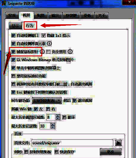 3.最后,在行为选项中点击勾选捕捉鼠标指针按钮即可