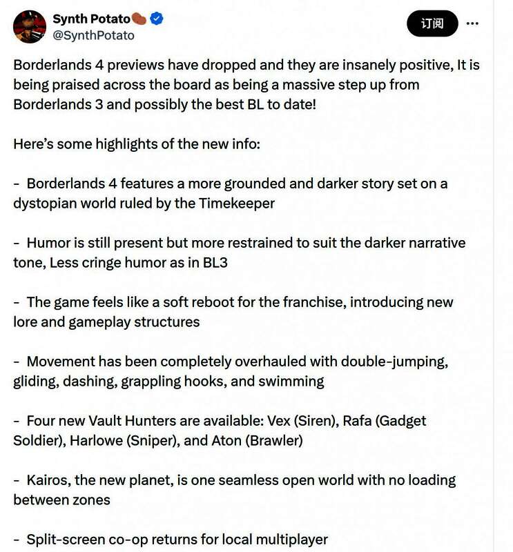 推主@SynthPotato表示《无主之地2》是其最爱的合作游戏之一,而《无主之地3》让他大失所望,但这一作听起来像是一次巨大进步,《无主之地4》将在9月12日正式发售,到时候肯定不能错过!
