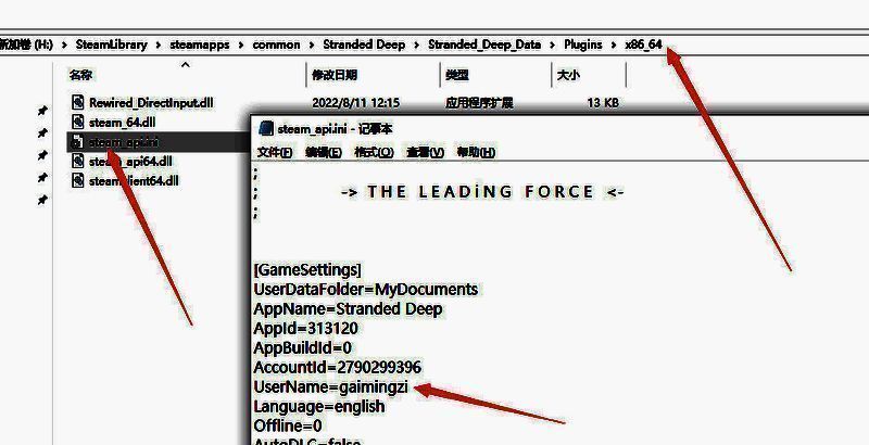 记事本方式打开\Stranded_Deep_Data\Plugins\x86_64\steam_api.ini,找到“UserName=gaimingzi”,把“gaimingzi”改成自己想要的名字。