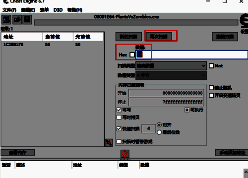 ait+tab再切换到ce。把数值改成50点击再次搜索。就剩下一条结果了