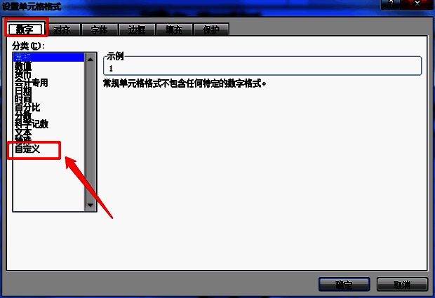 2、选择自定义:在“数字”选项卡中选择“自定义”。