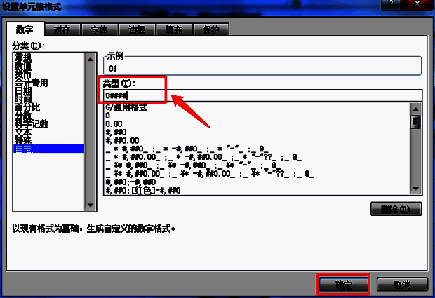 3、输入格式代码:在“类型”框中输入0####格式,点击“确定”。