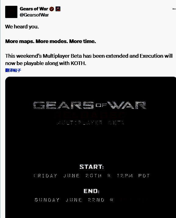 针对上周测试期间收到的负面评价,The Coalition工作室宣布延长本周末《战争机器:重装上阵》多人测试时间,并增加地图与模式。此次测试将于太平洋时间6月20日中午12点持续至6月22日晚9点,较上次测试延长9小时。