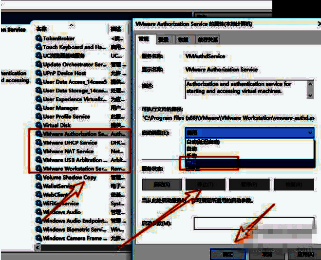 在这里会有电脑的很多服务,服务的启动类型可能是手动自动或者是禁用状态,这里滚动鼠标,找到所有和虚拟机相关的服务。(VMware开头的)