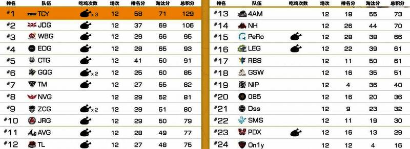 今日单日积分:①TCY 70分(连续两日#1) ②JDG 68分 ③EDG 51分 ④GQG 42分 ⑤JRG 39分 ⑥CTG 38分 ⑦4AM 33分 ⑧LEG 32分 ⑨GSW 29分 ⑩PeRo 26分 ⑮NIP 17分