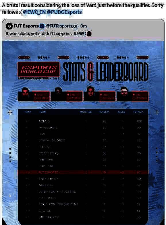 FUT官推发文说:“一切都是那么接近,但最后奇迹并没有发生。。”,知名PUBG主持人Kaelaris转发此推表示:”这是个残酷的结果,vard的离开造成了巨大影响。“