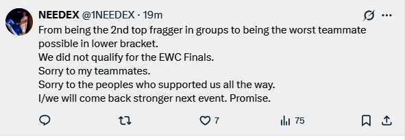同样未进入决赛的TMO成员法国人NEEDEX,说:”从小组赛我是战神榜第二(小组赛NEEDEX 23杀仅次于VP-NIXZYEE的27杀),到败者组比赛我是表现最差的队员(仅4杀,确实是队内表现最差),我们没有进入欧洲EWC预选决赛,我对不起我的队友,也对不起一直支持我们的粉丝,我承诺,下一次比赛我们会以更强的姿态回来!“