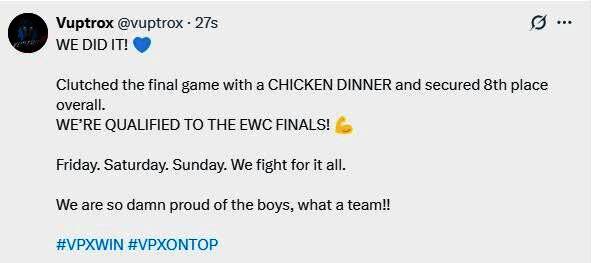 而首次晋级欧洲EWC预选决赛的德国老牌战队Vuptrox(VPX)自然是喜出望外,最后一把他们抓住机会吃鸡绝杀了FUT,以第8名的成绩晋级了决赛,VPX表示,在周五周六周日的决赛里,会倾尽全力战斗,俱乐部为这群男孩(的表现)感到无比的骄傲,太棒了,这个团队!