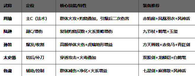 周瑜:必带【火烧连营】(群体火攻+叠加)+【赤壁灾炎】(引爆灼烧)。