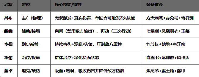 爆发连招:吕布(无双)→ 貂蝉(离间禁用敌方主将)→ 李儒(毒伤收割)→ 董卓(嘲讽抗伤)→ 华佗(保命续航)。