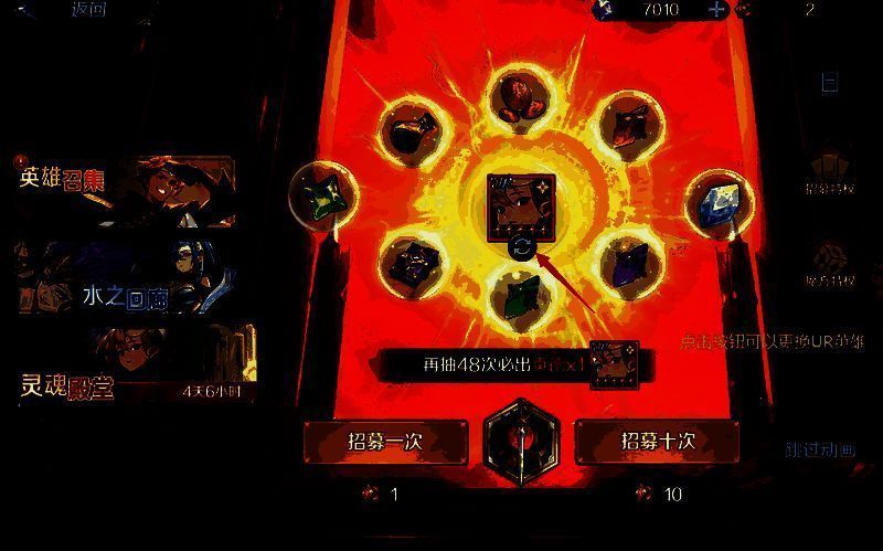 2、英雄招募玩法中--灵魂殿堂。通关消耗灵魂魔方招募可抽取获得,招募70次必定抽到选定的UR英雄。点击更换按钮,可以更换其他英雄。(可从贞德、什格里斯、安琪拉、凯文、贾诩中任选1个确定为招募英雄。)