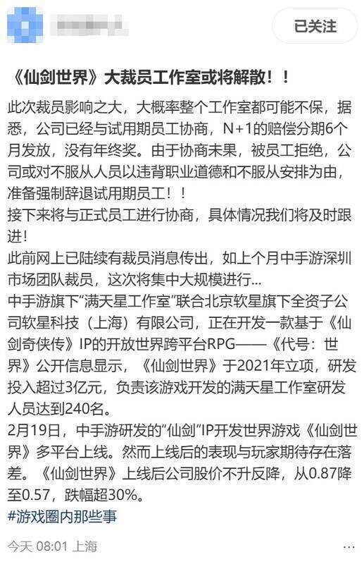 近日网上有消息称,中手游《仙剑世界》工作室大裁员,或将解散。在脉脉和小红书等平台上,有人说中手游这次裁员N+1的赔偿要分期6个月发放,还有人说公司对不服从人员采取了强制辞退措施。